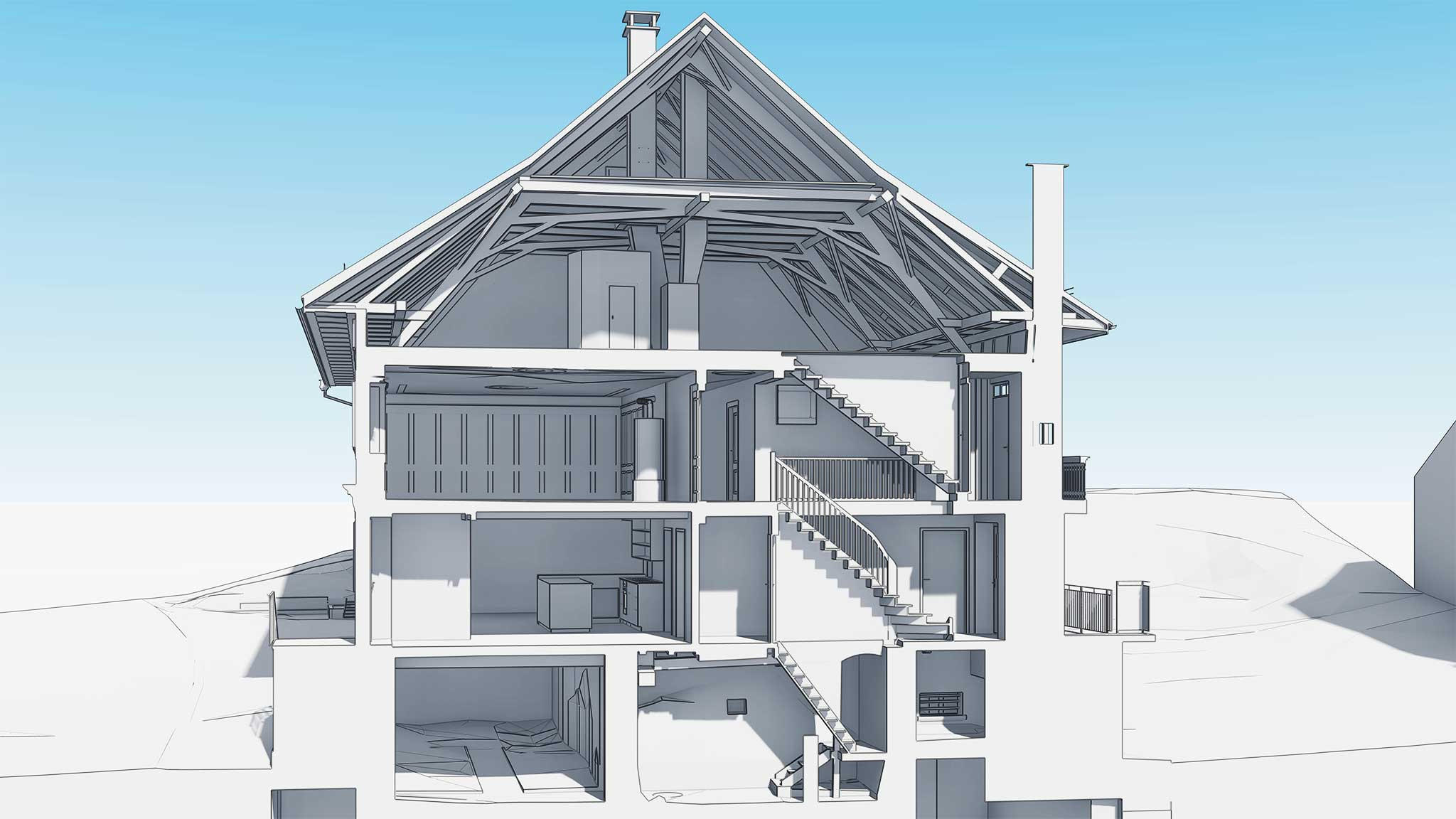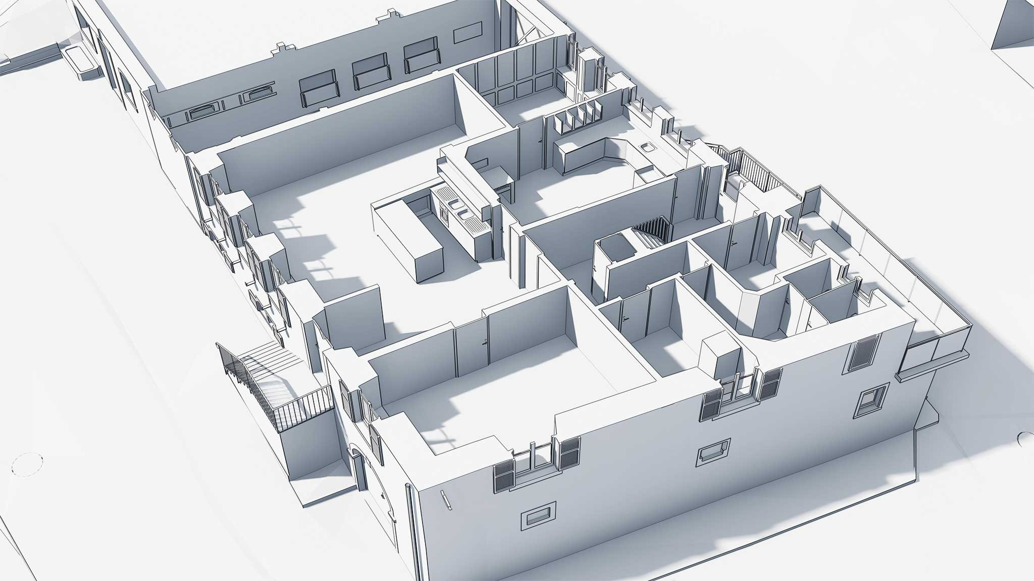 Auf Grundlage dieser Daten modellierte ING PLUS ein präzises 3D-Gebäudemodell in ArchiCAD, welches den Planern und Architekten als verlässliche Projektierungsgrundlage dient. Die Kombination aus Gebäudeaufnahme, 3D-Modellierung und digitaler Aufbereitung ermöglicht eine effiziente Planung des Umbaus und reduziert Unsicherheiten im Umgang mit der bestehenden Bausubstanz.